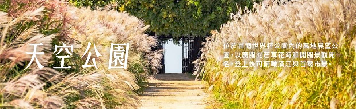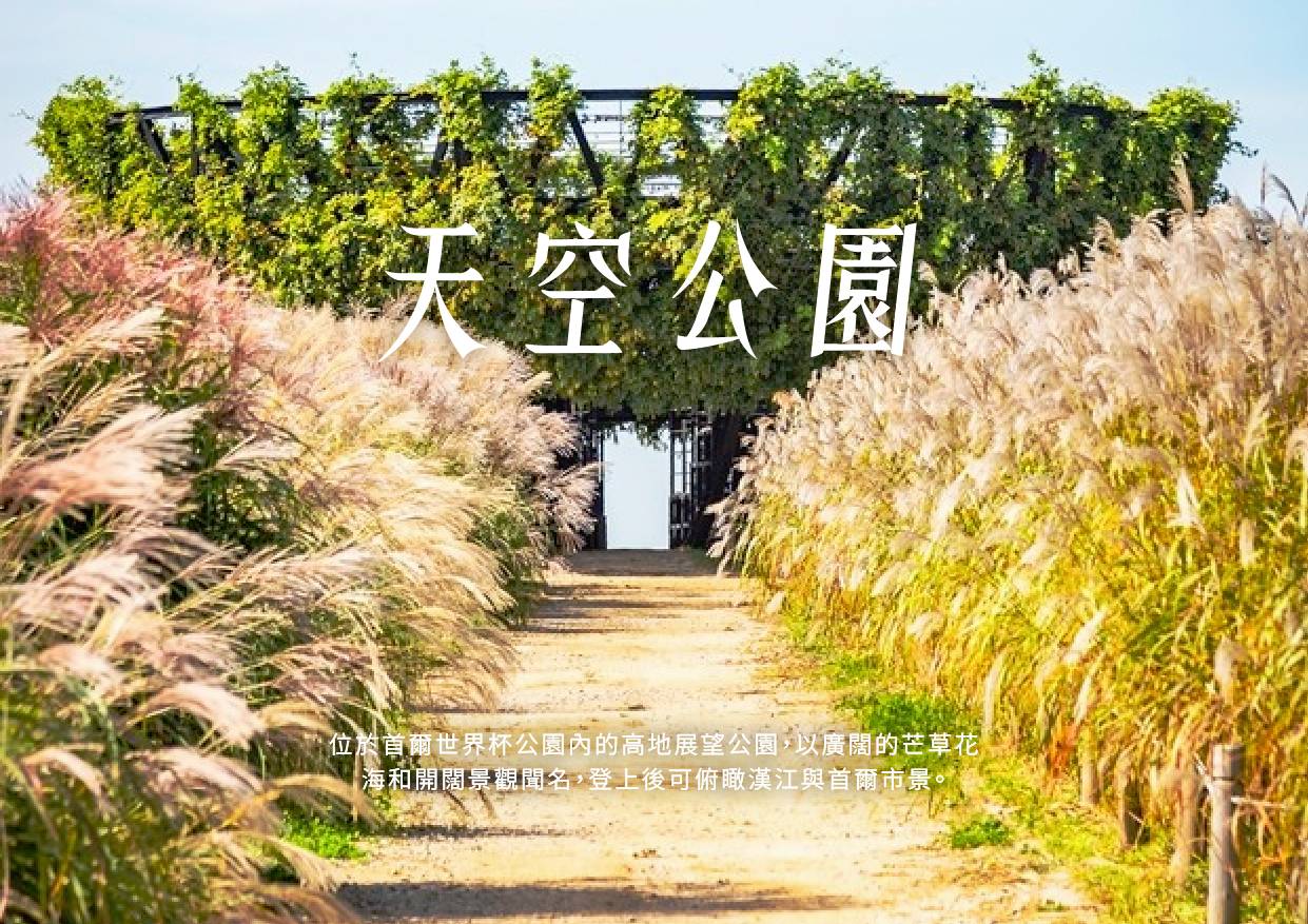 【天空公園(芒草公園)】是和平公園、蘭芝川公園、蘭芝漢江公園及彩霞公園等世界盃公園中,最高最接近天空的公園,所以顧名思義取名為天空公園,在夏天是整片綠油油的寬闊大草原,在秋季則開滿整片白茫茫的紫芒草,獨特自然景觀,吸引不少遊客之外,更是許多電視劇或MV的拍攝取景地。