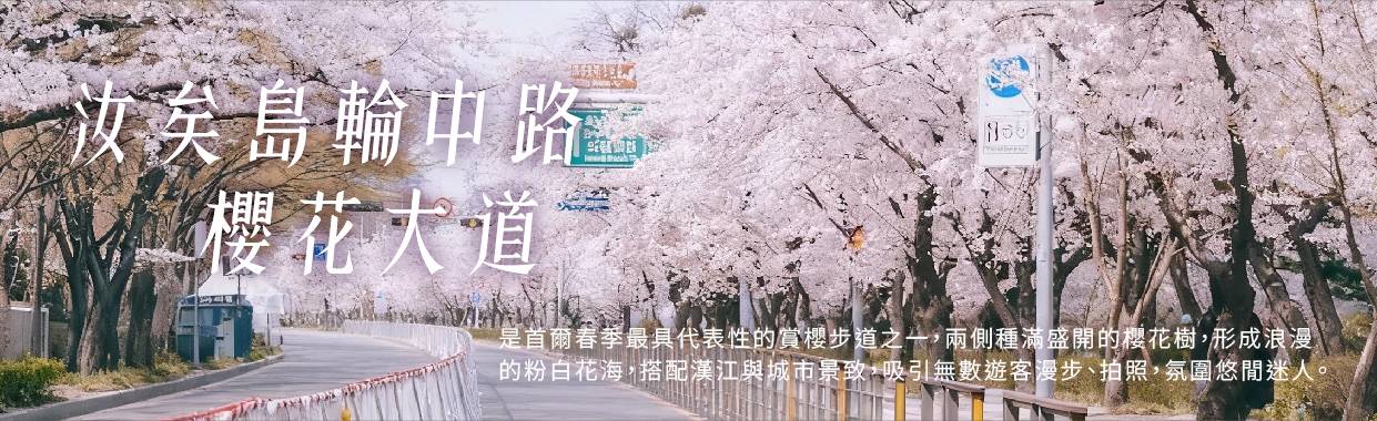 【汝矣島輪中路櫻花大道】杜鵑、迎春花、躑躅等春花齊放的4月初,會定期於汝矣西路(輪中路)展開一場春之饗宴,約有1400~1600棵的櫻花樹在此綻放盛開因而聞名。慶典期間,汝矣島國會議事堂後方的道路將進行車輛進出管制,漫步在櫻花隧道下欣賞漢江景色更是愜意,每到夜晚特殊的景觀照明,照映在櫻花上,呈現出另一番的美麗春夜風景。此外現場還會展開各種街頭表演、展示或體驗活動,邀請遊客們一同共襄盛舉。