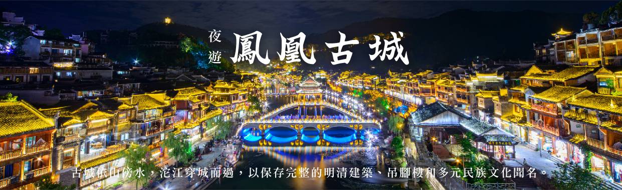 【鳳凰古城】曾被新西蘭著名作家路易‧艾黎稱讚為中國最美麗的小城。鳳凰古城旅遊資源極為豐富,建築古樸典雅,人文和民族氣息濃鬱。縣城建設古樸典雅,北門、東門古城樓,沱江河畔的吊腳樓別具一格,還有那飛簷鬥角的萬壽宮、大成殿、天王廟、遐昌閣、萬名塔,構成了一幅美麗的畫卷。每到夜幕降臨,華燈初上,鳳凰古城就會被五彩斑讕的燈火裝扮得分外妖嬈,分外漂亮。