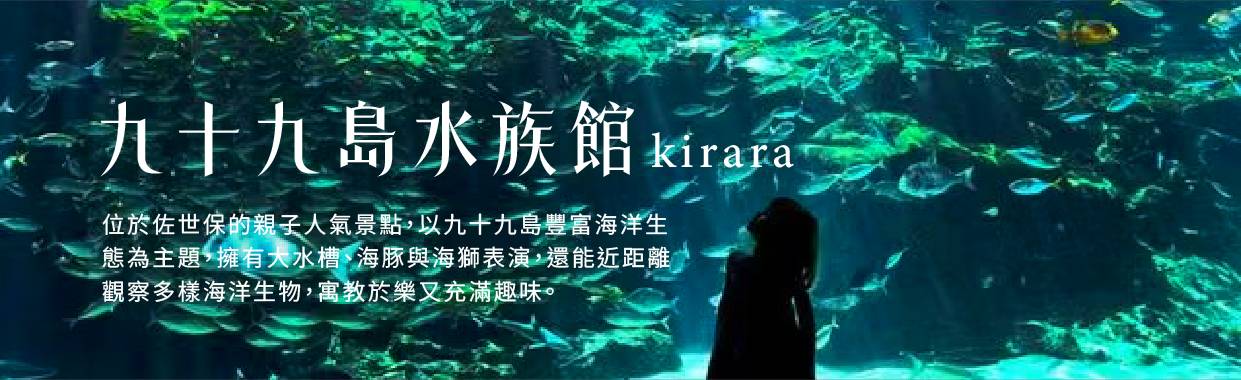 【九十九島水族館 kirara】位於九十九島珍珠海洋遊覽區內的「九十九島水族館海閃閃」重現並展出了這片海域及近海的生態,可欣賞到各式海洋生物,包括展現表演技巧的海豚、綠蠵龜、以及成群悠游的沙丁魚等,您也可自費體驗挖珍珠的活動。