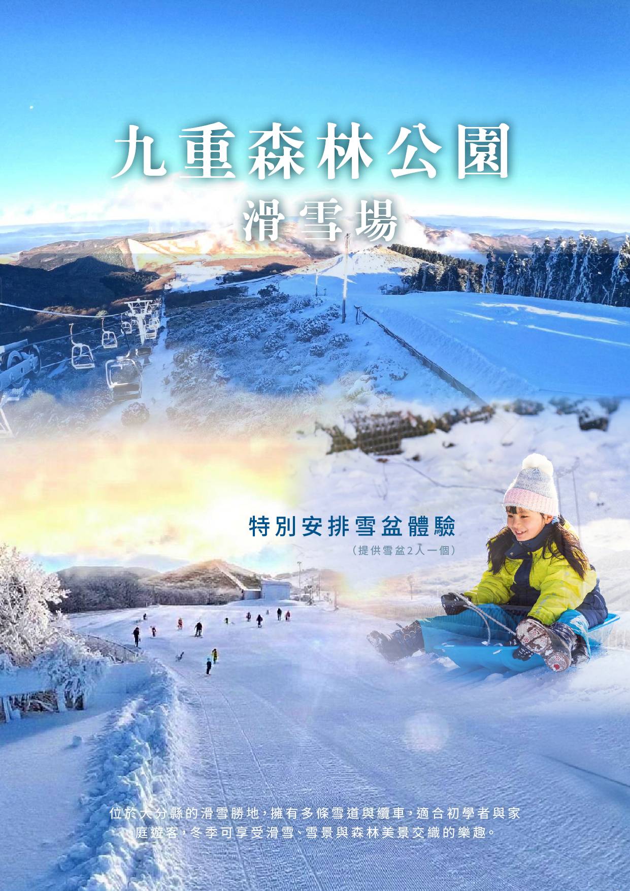 【九重森林公園滑雪場】在氣候較炎熱的九州裡,位於大分縣的九重森林公園滑雪場是九州最大型的滑雪場,擁有不同難度的滑雪道及不同設施可供各個年齡層遊玩,在此本公司特別安排雪盆暢玩體驗!