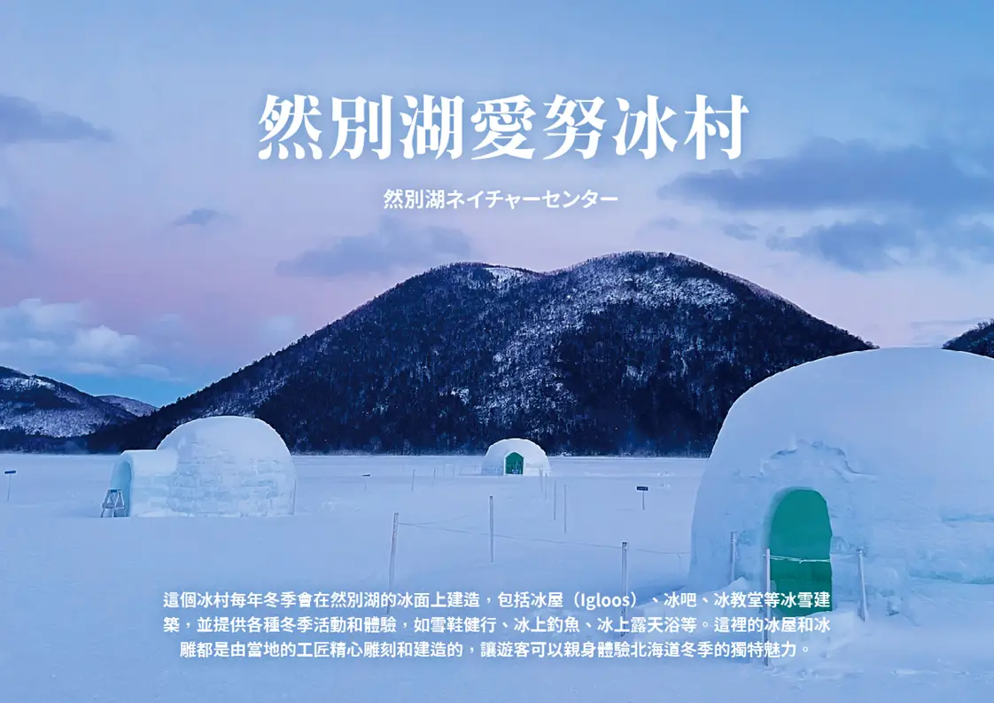 【然別湖愛努冰村】然別湖村小簡介 日文「コタン(Kotan)」這個字來自於北海道當地居民使用的阿伊努語(Ainu)中「村莊」一詞,顧名思義,是一個在一月下旬到三月上旬建於然別湖上,平均溫度低於零下15度的冰村。 然別湖自然中心的嚮導友香內藤小姐向我們解釋了這座神秘的湖上冰村就像是大自然的祝福,結合了酷寒環境與美麗湖水的產物。