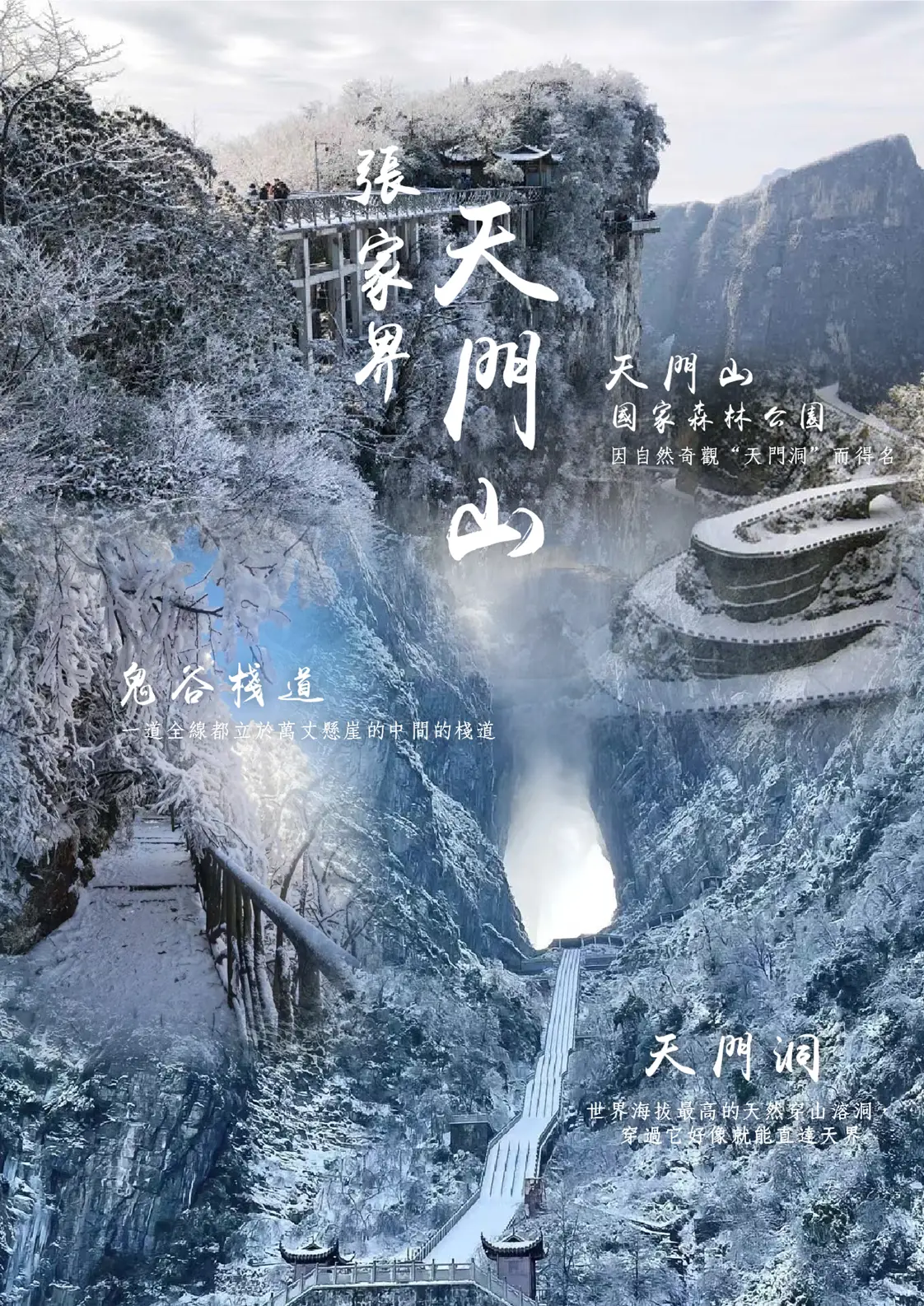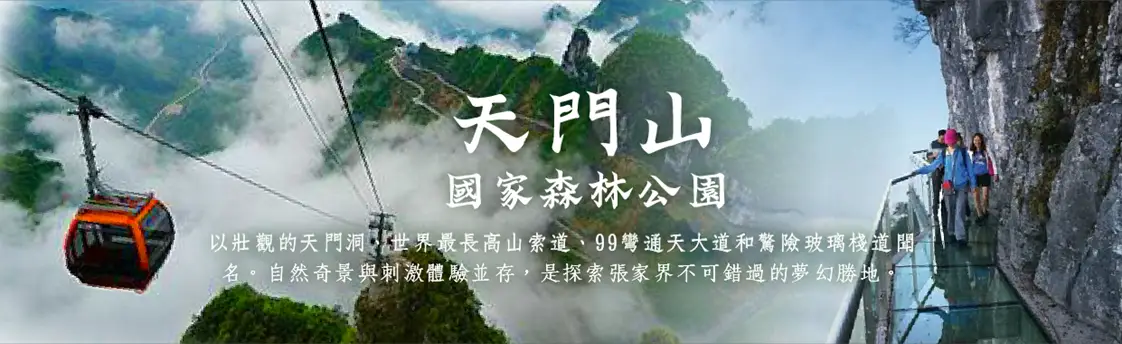 【天門山國家森林公園】因自然奇觀「天門洞」而得名,天門洞是巨大的穿山溶洞,經常霧氣瀰漫,走上到達天門洞的台階有種登上天庭的感覺。 除此之外,還可以在纜車中俯瞰腳下99個彎的盤山公路和山中美景。膽大的還可以走一走貼壁懸空的玻璃棧道,體驗凌空行走的刺激。