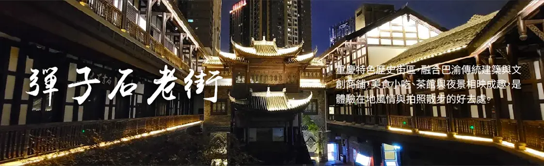 【彈子石老街】又名彈珠石老街,位於重慶市南岸區,是全國首個以開埠文化為主軸的,百年老街與現代都市景觀結合,並以九級坡地方式立體呈現的集歷史文化、觀光、休閒、娛樂、購物於一體的綜合型景區。2017年彈子石老街被評定為國家AAAA級旅遊景區。2021年11月5日,被文化和旅遊部確定為第一批國家級夜間文化和旅遊消費集聚區。