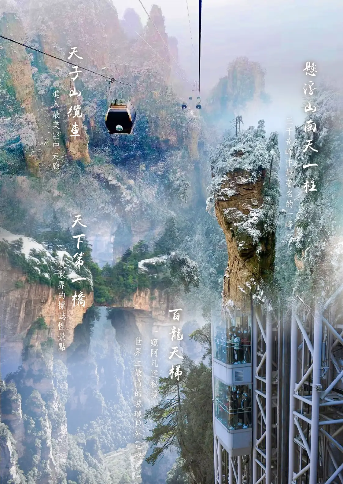【張家界】因擁有世界自然遺產武陵源風景區而聞名。武陵源由張家界國家森林公園、天子山、索溪峪、楊家界等組成,原始森林遍佈,有各種奇峰怪石,景色壯美,是電影《阿凡達》的取景地之一。