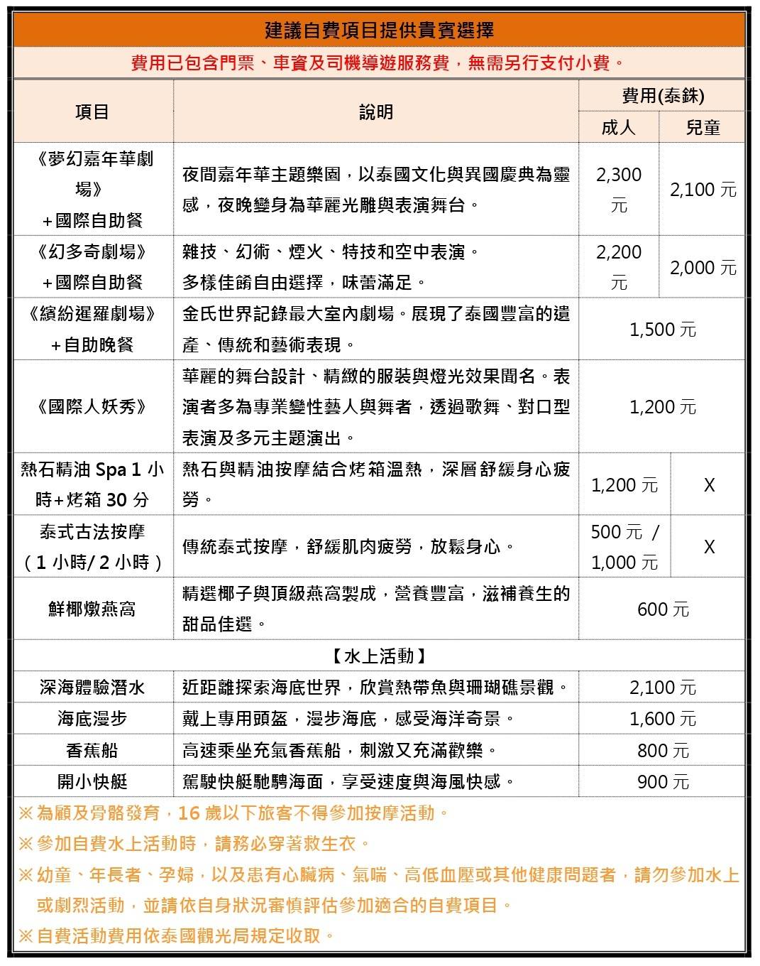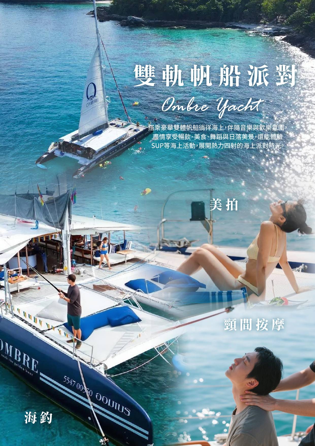 ①空間寬敞穩定,航行過程舒適不暈船!②一次玩轉皇帝島+珊瑚島,雙跳島美拍不漏拍,浮潛天堂不容錯過,不下水也精彩!隨手一拍皆是明信片風景。③船上還有免費肩頸按摩,邊吹海風邊放鬆,超享受!④與美女人妖拍照互動:精彩華服登場,留下最具泰味的回憶合照⑤海上滑梯嗨翻天:從帆船直衝海面,刺激又消暑(依照船型安排)⑥SUP立槳挑戰平衡感:站在海上感受如畫般的視角⑦海釣樂趣無窮:放下魚線,享受當地漁夫的樂趣⑧美食與美景雙享:下午茶時間精緻登場:甜香誘人的芒果糯米飯,搭配茶點,療癒味蕾,飲料啤酒無限暢飲:沁涼一夏,補足航行能量!