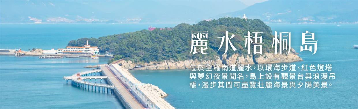 【麗水梧桐島】梧桐島是麗水市諸多島嶼中最著名者,也是麗水市名聞遐邇的景點,一直是韓國人蜜月旅行及畢業旅行的最佳選擇,每年接待遊客150萬人以上,是一處藍色海洋和神秘自然相協調的可愛之島!梧桐島面積127,000㎡,因為島嶼外觀類似於梧桐樹葉被稱為梧桐島,據傳這裏以前因生長了許多梧桐樹而聞名於世。島上除了許多冬柏(山茶花)和竹子外,還生長著五爪楠、朴樹等共190多種稀有樹木,森林鬱鬱蔥蔥終年長綠。