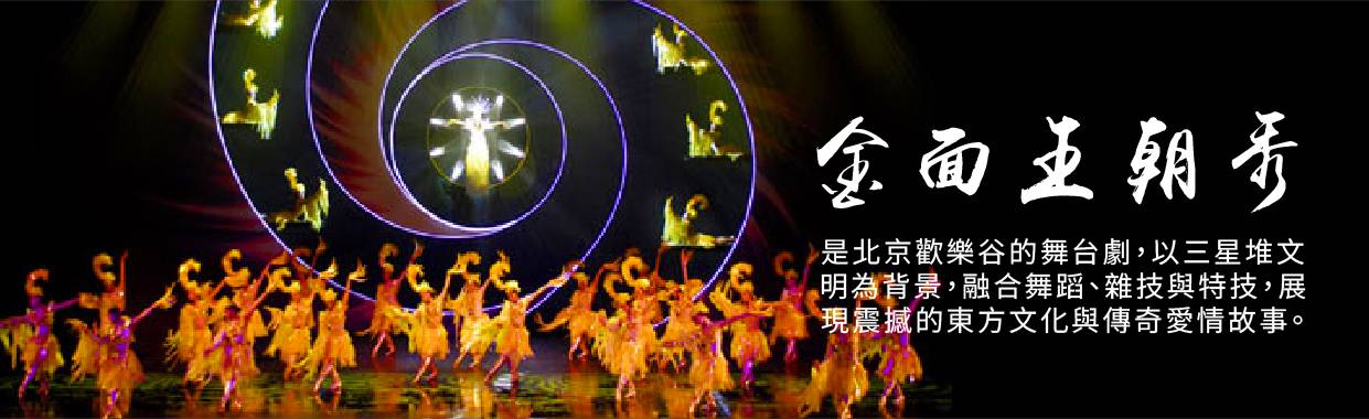 【金面王朝秀】在北京歡樂谷華僑城大劇院上演的《金面王朝》,是國內頂級創作與運營團隊打造的大型舞蹈史詩劇。背景取材自神祕的 三星堆文化,融合遠古文明與神話色彩。是一部結合舞蹈、音樂、燈光與舞臺劇的現代詩劇。演出以一位頭戴金面具的王后為主角,經歷戰爭、和平、祭典與幻化,共分八大章節。舞臺設計非常震撼——有旋轉升降的 360° 大舞臺、立體燈光與聲效、華麗服飾與面具,每一幕都像一幅流動的畫作。