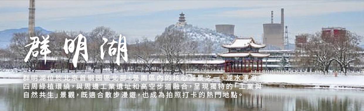 【群明湖】群明湖位於北京市石景山區的首鋼園內,是由首鋼工業用冷卻循環水池改造而成的人工湖泊。其湖面與周圍工業遺址、滑雪跳臺、冷卻塔等構築出強烈的「工業風 + 湖光山色」對比景象。湖水清澈見底,水面波光潤動,湖邊設有長椅與休憩區,是拍照打卡、午後散步的好所在。遊客可沿着羣明湖大街漫步,觀賞湖心島、公園長廊與石拱橋等景致。