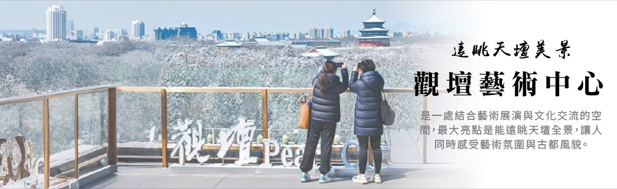 【觀壇藝術中心】登上北京紅橋市場頂樓的觀壇藝術中心,眼前便展開一幅壯麗的畫面——天壇祈年殿的藍瓦圓頂在城市屋簷間靜靜矗立,是北京難得一見的美景角度。這裡不只是觀景平台,更是融合咖啡館、書房與文化展覽的複合空間,讓你在喝茶之餘,也能細細品味歷史與當代的交錯。