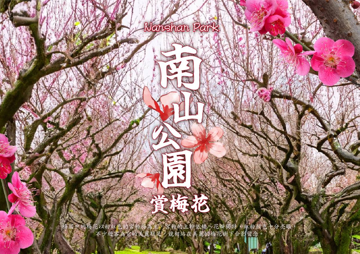 【南山公園賞梅花】梅園始建於2003年,栽植有紅妝、送春、豐後、垂枝、美人等近十個品種。園內植有400餘株梅花。成片的梅花爭相綻放,遊客們仿佛置身於花海之中。有言道梅開五瓣,象徵五福快樂、幸福、長壽、順利、和平,自古都被視作吉祥之物。