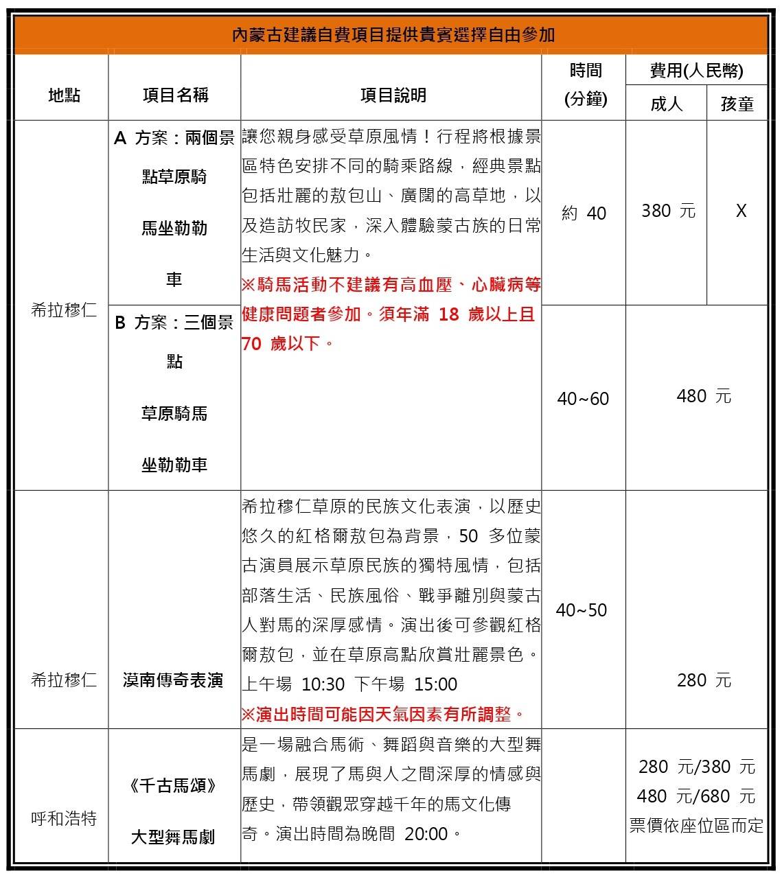 3. 自費專案預定後如有異動,將會有費用產生,請大家體諒導遊辛勞!