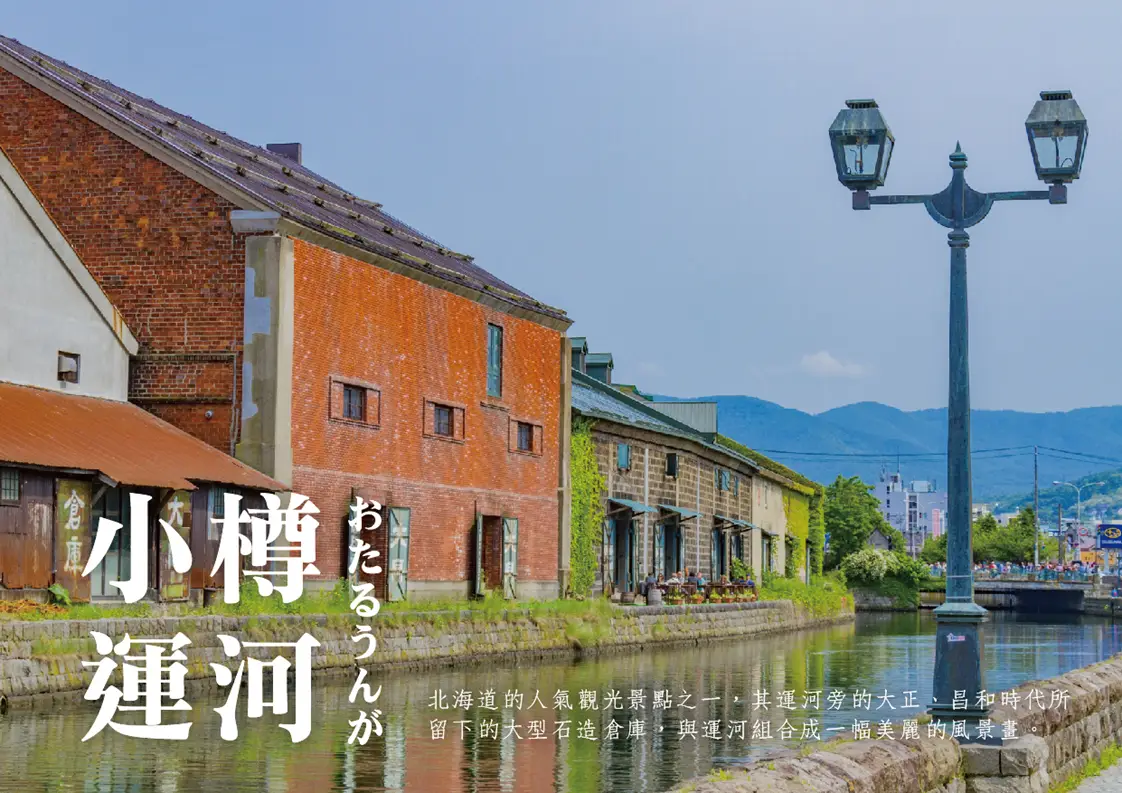 【人氣觀光景點小樽運河】北海道的人氣觀光景點之一「小樽運河」建告於大正三年,共花費九年的時間完成,寬20~40公尺不等,全長1300公尺。其運河旁的大正、昌和時代所留下的大型石造倉庫,與運河組合成一幅美麗的風景畫。兩側有滿滿一排的石造倉庫,運河廣場附近的瓦斯燈,則要在半昏暗的夜色中方能顯出它的綺麗。漫步在悠揚的小樽運河,任身影在夕陽餘暉裡伸展。