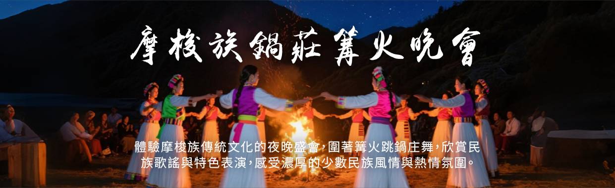 【篝火晚會】瀘沽湖是女兒國,又是歌舞的王國。瀘沽湖畔的摩梭村寨,和帥氣的摩梭小夥子、美麗的摩梭姑娘一起,圍著篝火跳起歡樂的舞蹈!摩梭女人挑選自己情郎的佳期;晚會男女手牽手圍成一圈,中間燃起篝火載歌載舞,姑娘們穿戴整齊,所有飾品都戴在身,頭纏黑布大包頭,身穿白色百褶裙,高聲歌唱對情歌,再端上一碗“蘇理瑪”酒,要情郎當眾誓言忠誠。