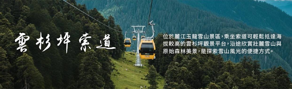 【雲杉坪索道(纜車上下+棧道電瓶車)】從白水河乘索道至雲杉坪,沿途可欣賞森林景觀。雲杉坪其實是玉龍雪山主峰扇子陡半山腰的一個高山草原,海拔3240米,面積有1平方公里,就像是一處隱藏在原始雲山林中的牧場,納西族稱雲杉坪為「舞魯的翠閣」是納西族神話理想中的「玉龍第三國」,夏秋芳草如茵,冬春白雪粉妝彷彿人間仙境,可慢步細細欣賞美景,也可自費搭乘環保電瓶車前往草原區。