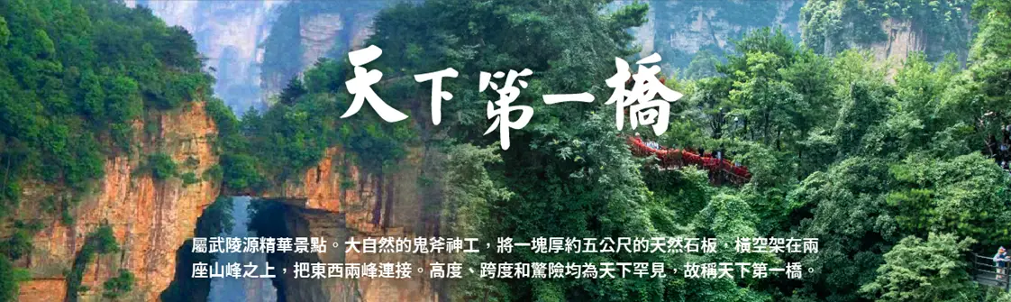 【張家界】因擁有世界自然遺產武陵源風景區而聞名。武陵源由張家界國家森林公園、天子山、索溪峪、楊家界等組成,原始森林遍佈,有各種奇峰怪石,景色壯美,是電影《阿凡達》的取景地之一。