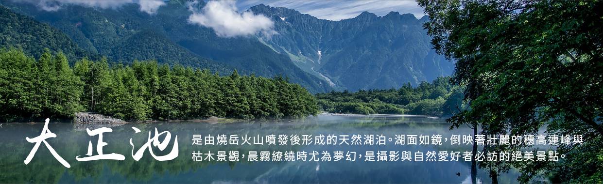 【大正池】是20世紀初由於燒嶽的噴火、梓川受堵所形成的池。其藍色的水面上突顯的枯樹與周圍構成一種獨特的風景。被稱“薄綠的霧”的白樺樹嫩芽初萌的6月和紅葉最旺的10月來訪的遊客特別多。梓川上長36.6米、寬3.1米的木製吊橋【河童橋】成上高地的標誌。河童橋的眼前聳立著穗高連峰,遠處可以眺望南面燒嶽嫋嫋上升的白煙,被稱感受上高地最好的照相地點。