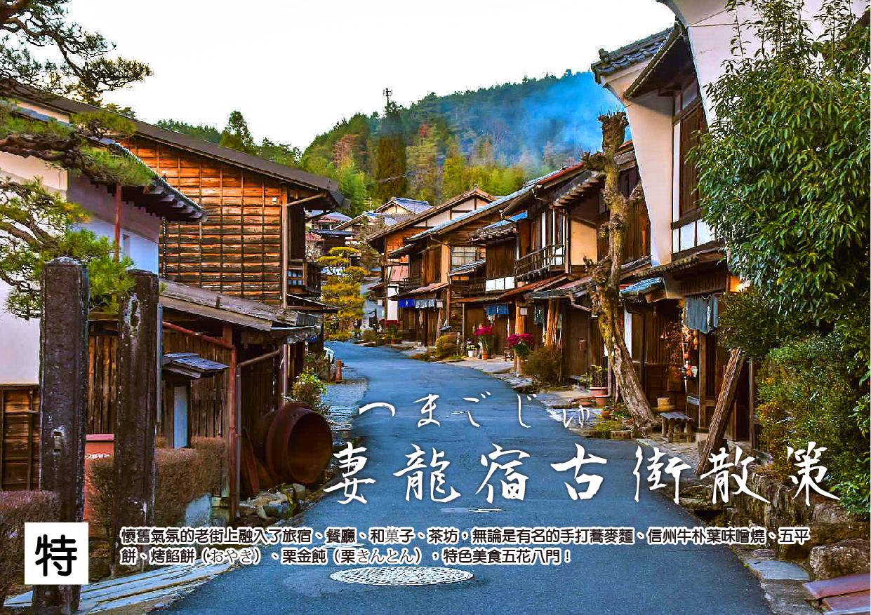 【馬籠宿】或【妻籠宿】此乃當年江戶和京都的中山道,因穿越深山的木曾路而被稱作木曾街道,沿途景象彷彿回到當年的場景,充滿著江戶時期的味道,它是六十九個驛站中的第四十二個,由於街道建築保存良好而成為日本傳統建築群的保留區。