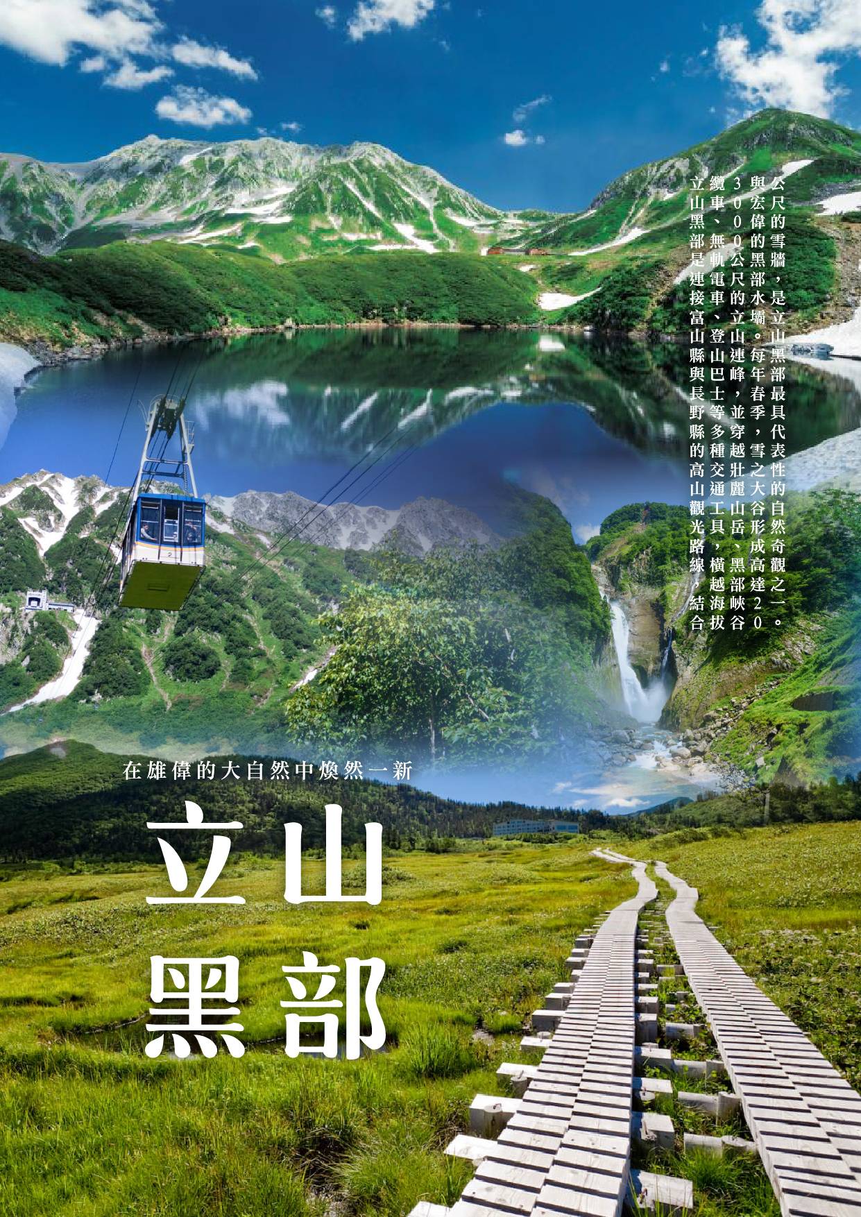 【立山黑部】立山連峰和黑部峽谷連成的阿爾卑斯之路,是國際級的山岳觀光路線,沿著富山縣間的中部山岳國家公園主脈而行。群山幾乎都是3000公尺級的連峰,構成日本北阿爾卑斯山的屋脊。日本是春夏秋冬(季節)變化分明的國家。其中,立山黑部阿爾卑斯登山路線的大自然景色,更是隨季節優美地變化。還可在海拔高度差不同的各處能觀賞到別開生面的風景。剛開通時能見到具有動感的雪牆,大雪融化時能見到百花盛開的高山花叢,秋天楓葉會以每天30米的速度,從山頂染紅到山腳,在一瞬間染紅整個山峰,白雪皚皚的山頂和滿山楓葉的山腰,會形成鮮明的對比,猶如一幅美麗的風景畫。由於冬季積雪太深,高山雪封時間長達4個月,每年四月下旬至十一月中下旬才可全線行車。四月開始通車之前,雪車在積雪中挖出一條雪道,穿越兩旁二十公尺高十分壯觀的雪壁,震懾之餘,也感受到另一種自然之美。因此每年春天山路再開之時,都會引起轟動。阿爾卑斯之路最迷人的地方在它大山的開闊、登高的景色變化,還有它多樣的交通工具,藉由不同交通工具讓您輕鬆翻山越嶺,飽覽高山狹谷之景,瀑布溪流之美,還有人工水壩的宏偉壯觀,特別能帶來旅途的興奮。