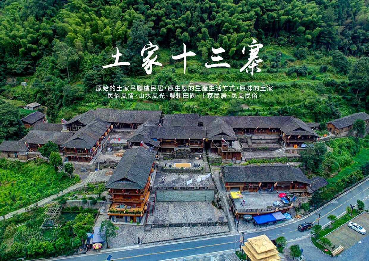 【土家十三寨】國際AAAA級旅遊景區 位於重慶市黔江區小南海鎮新建村,東鄰小南海地震遺址公園,南鄰八面山自然風景區,西過茨竹溪連接武陵仙山,北接渝鄂勝景雞公山,距黔江主城區約30公里,景區面積為6.5平方公里,有13個典型的土家院落,這裏集居生活着200多户近1000名土家族人。 十三寨沿板夾溪兩岸分佈,寨子以半包圍品字形、全包圍四合院、吊腳樓多種樣式。屋頂花屋脊和翹角,四周欄杆走廊,雕欄花窗。原始的土家吊腳樓民居,原生態的生產生活方式,原味的土家民俗風情,山水風光、農耕田園、土家民居、民風民俗。