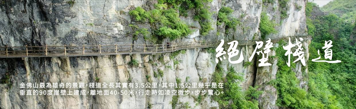 【絕壁棧道】是金佛山最為雄奇的景觀,棧道全長其實有3.5公里,其中1.5公里幾乎是在垂直的90度崖壁上建成,離地面40-50米,行走時如凌空微步,步步驚心。這一段一般被稱為绝壁栈道。它如一線串珠連起了金龜朝陽、箭竹海、靈官洞、生態石林等景點。其中,燕子洞是與恐龍同時代的古岩燕栖息之地,若遇岩燕外出覓食或歸巢,游人可看到萬燕齊飛的壯觀景象。行走栈道,霧日穿雲而行,晴天一覽眾山。是觀杜鵑、彩林、雲海、佛光的最佳位置。