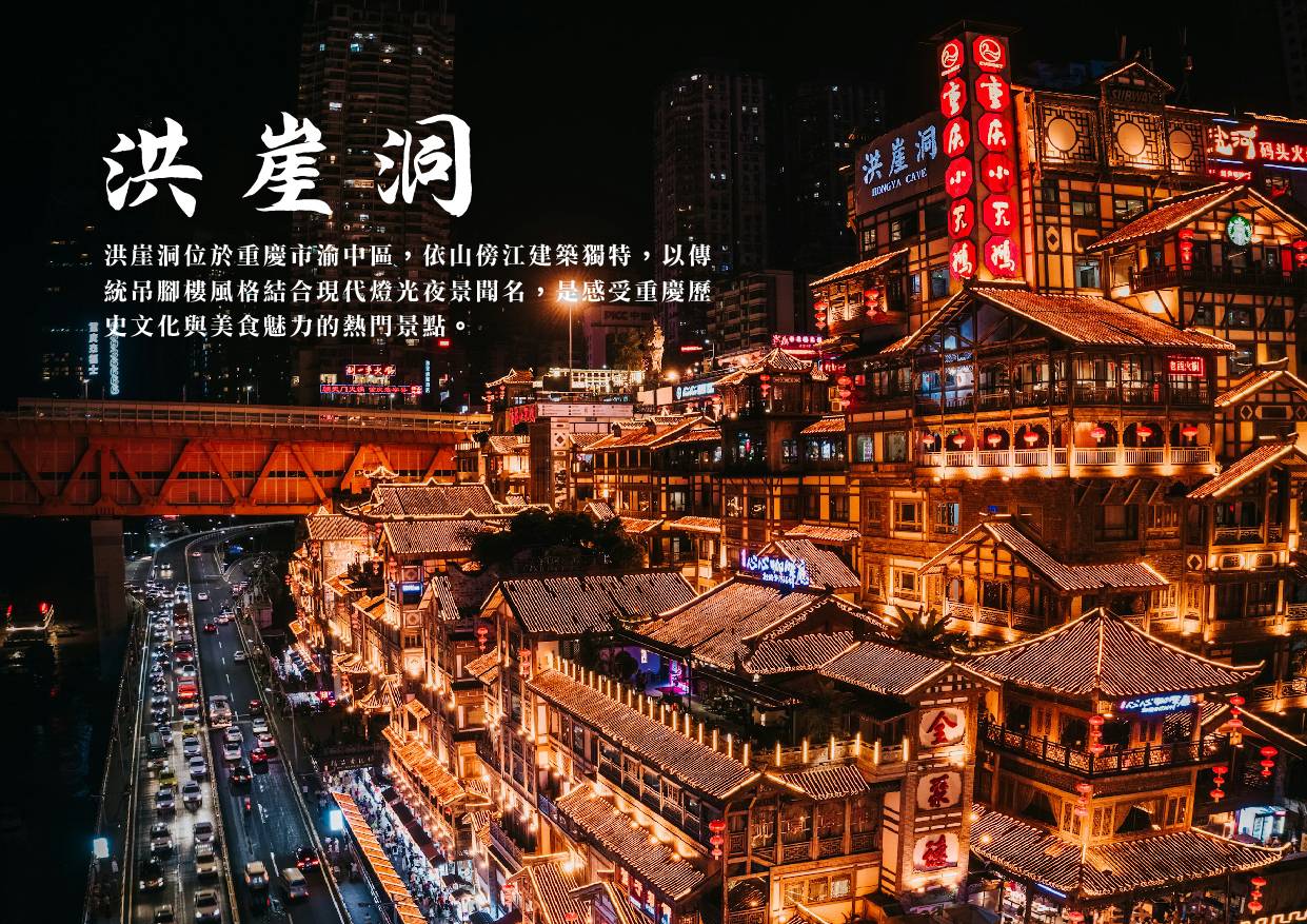 【重慶市】位於中國四川省東部、長江上游,地處丘陵地帶,由於多山多霧因此有『山城』、『霧都』的別稱,冬暖夏熱的天氣成為長江三大火爐之一,春夏之交夜雨興盛,因此有『巴山夜雨』的稱號;嘉陵江流經市內古稱渝水,故重慶市簡稱渝,長江也貫穿重慶,是中國面積最大、行政轄區最廣、人口最多的中央直轄市,面積約為83000平方公里。