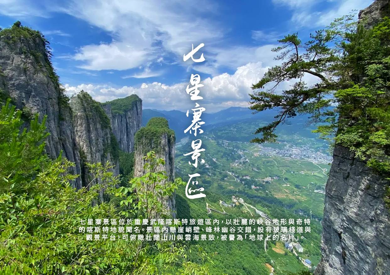 【七星寨景區】七星寨絕壁為三疊系灰岩中發育的巨型柱狀岩體群,兀然直立於陡坡上,高聳林、,極為壯觀。它不同於峰林及石林,而是一種柱狀山體,故稱"岩柱林"。正對的"岩柱"實際上是巨型岩柱塊,長800米、寬150米、柱高近200米,頂部是兩頭高、中間低的弧形平面,這是因為頂面中央有個匯水小水塘、形成了表層窪地。19世紀40年代民國抓壯丁時期曾有十幾個小夥子在其頂躲藏十餘天,峰頂還能找到當年他們生活的炊具。