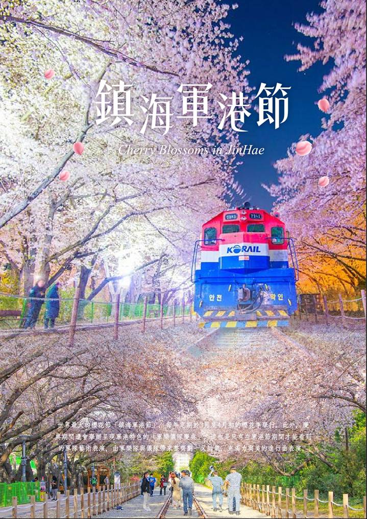 【鎮海軍港節(賞櫻)】是韓國最具代表性的賞櫻勝地,共種植8萬多棵櫻花樹。每逢櫻花盛開的3月底至4月初為此處櫻花盛開時節,粉白相間的櫻花樹花技招展,擁有無限美麗的余佐川櫻花道與火車鐵道兩旁連綿不絕的櫻花樹,給人置身仙境的幻覺。每年固定舉行為期10餘天的慶典盛會不管是規模還是歷史層面上都是韓國最大的櫻花慶典。