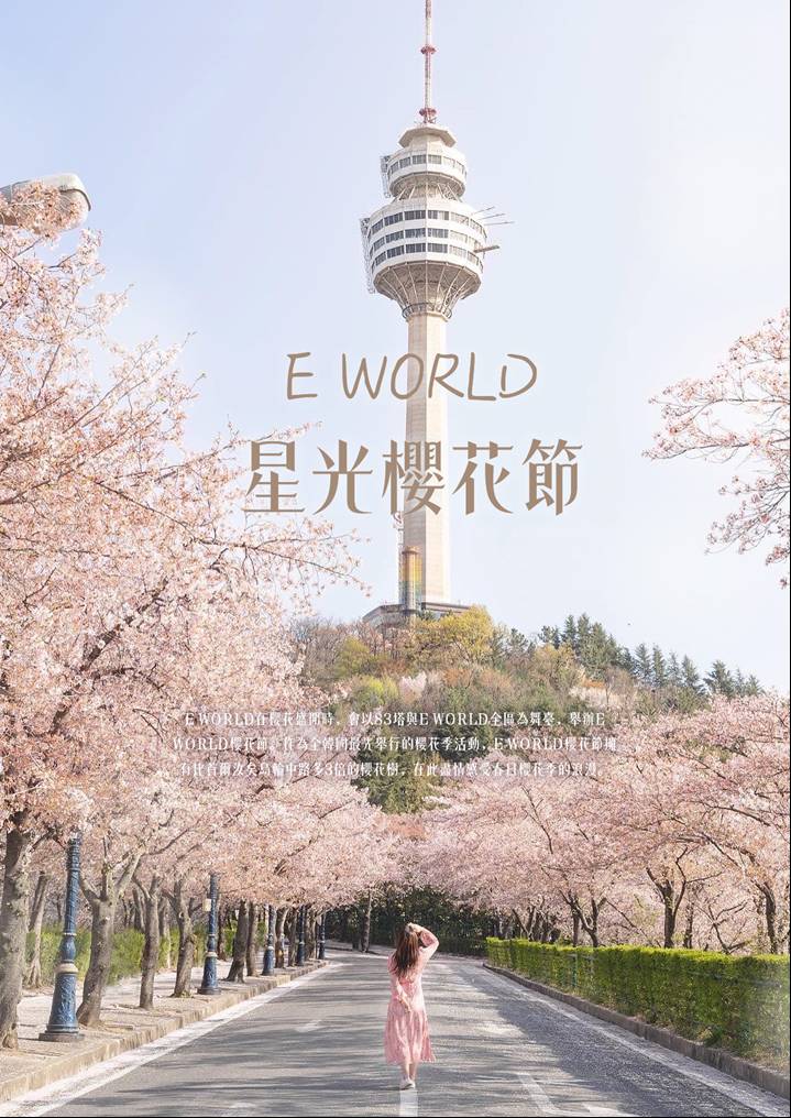 【E WORLD星光櫻花節】為全韓國唯一的夜櫻慶典,呈現如夢似幻的氛圍。漫步其中,彷彿來到新世界。慶典不僅將以830萬個LED燈裝飾整個E WORLD園區,遊樂園中的每條街道也準備了各式各樣的街頭表演、豐富的體驗活動、粉紅市集等,讓人目不暇給。