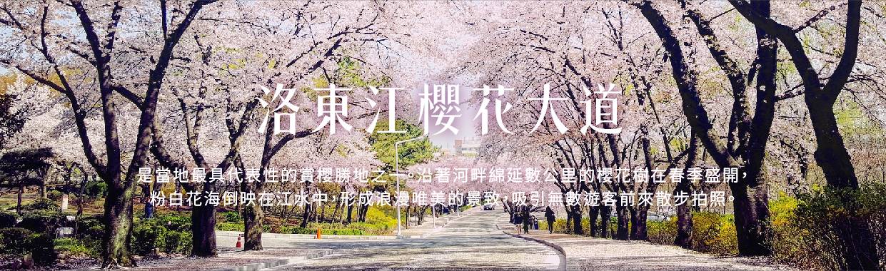 【三樂江邊公園+洛東江櫻花大道(季節性賞櫻)】三樂生態公園狹長的步道邊,每年春天都會開滿櫻花,兩側共1,200棟的櫻花林形成了壯觀的「櫻花隧道」。這裡也曾被選為「韓國最美的100條道路」,是全國知名的賞櫻聖地。全長7公里的公園順著洛東江所修建,在堤防上也有約5公里的散步道路。近來還新種了櫻花、山躑躅等植物,並增設展望台、休息區,讓這裡的環境更加舒適。