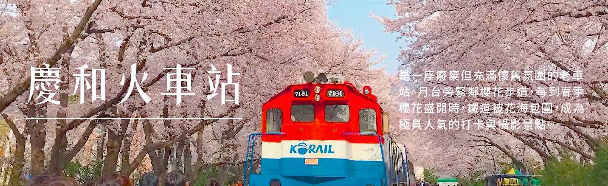 【慶和火車站(賞櫻)】已停用的火車站,現開放給遊人,只是偶爾會有備用火車經過。路軌兩旁種滿了櫻花樹,景緻優美,是不少韓劇的取景處,亦是戀人們及家庭的消閒好去處。