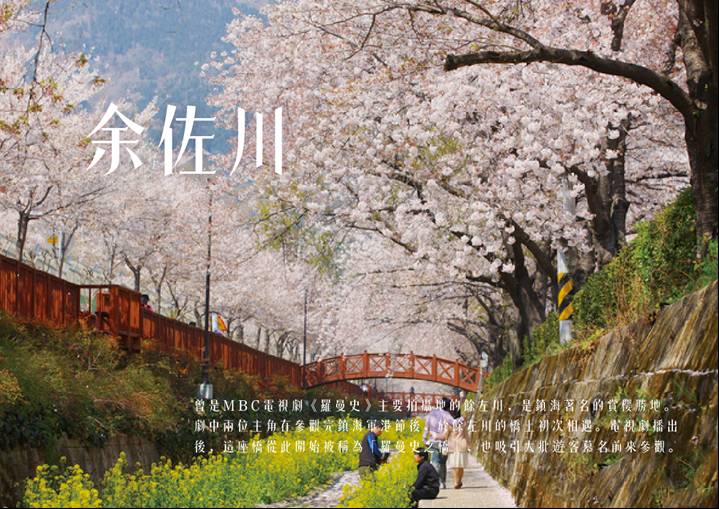 【余佐川(賞櫻)】曾是MBC電視臺戲劇《羅曼史》主要拍攝取景地,以身為鎮海賞櫻聖地為名,劇中兩位主角在參觀完鎮海軍港祭後於余佐川的橋座上初次相遇。每逢4月份春季時節,櫻花開滿遍布於整座城市,這也是鎮海被推選為最美麗的賞櫻地區主要原因,從各地遠道而來賞花的遊客歡歡喜洗聚集在櫻花樹下郊遊野餐的景象,也成為這裡更加亮眼的一道風景。