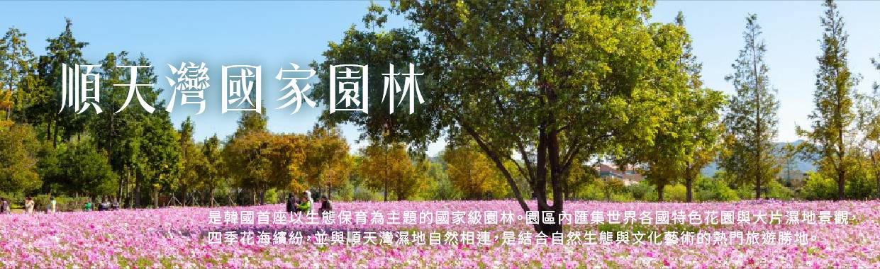 【順天灣國家園林(含遊園車)】是為保護世界五大沿岸濕地之一的順天灣而打造出的韓國第一座國家庭園,庭園佔地112萬婷方(34萬坪),植有505種、79萬株樹木,及113種、315萬株花。每逢春天,鬱金香與躑躅等百花齊放,形成壯麗景觀。