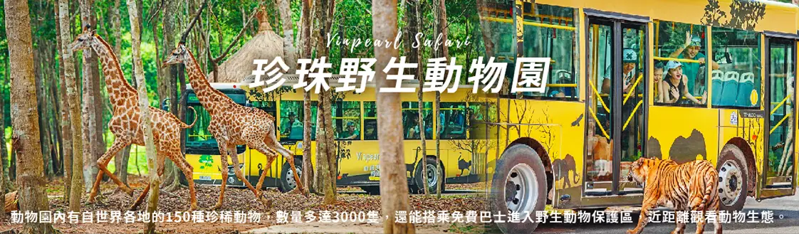 【VinPearl Safari 珍珠野生動物園】這裡擁有世界上珍貴稀有動物數百種類:如孟加拉虎,犀牛,火鳥等,園區周圍還有數千種美麗的樹木與鮮花。內部有規模地區分為ZOO 動物園區、PRIMATE WORLD 靈長類動物園區及SAFARI 探索園區三大結構,特別安排搭乘SAFARI 遊園車,進入野生動物園區,體驗稀有的野生動物近在咫尺的感覺。在這裡可以看到一家之主獅王霸氣帶領母獅群、精瘦猛虎闊步巡視、河馬特有的慢節奏戲水、高人一等的長頸鹿優雅線條、成群斑馬身穿條紋制服悠閒進食,以及輕巧羚羊小跑步猶如跳家家酒等,絕對可以滿足您對動物園旅遊的期待。