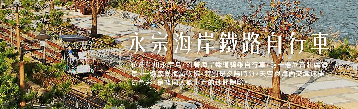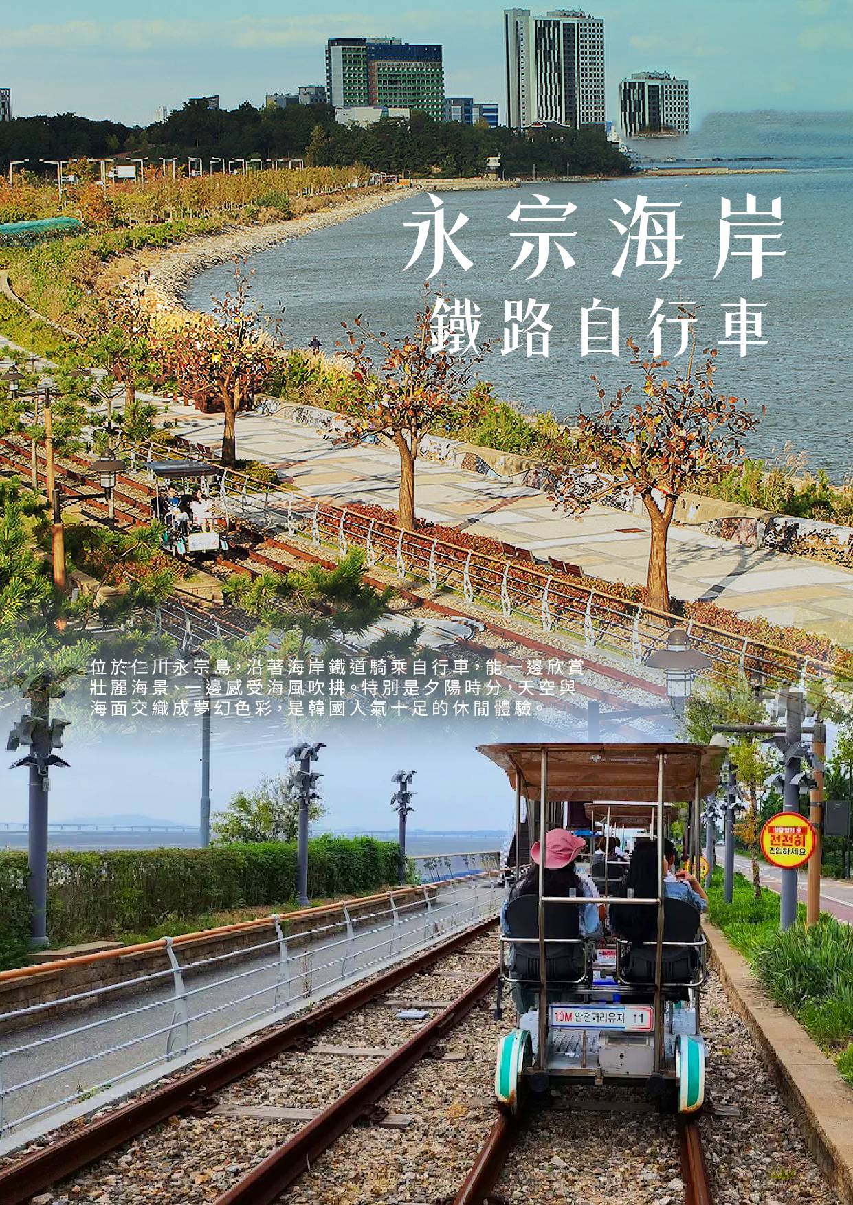 【永宗海岸鐵路自行車】海岸公園是永宗島上面積接近汝矣島的景點。位於公園內設有海岸鐵路自行車,最多可乘坐4人,遊客可沿著海岸騎乘來回5.6km的路線。騎著鐵路自行車時,可欣賞從月尾島至仁川大橋開闊的海岸線,同時感受馳騁與賞景的樂趣。鐵路自行車的路線中還設有景觀瀑布和各種設施,為遊客提供不同的樂趣。