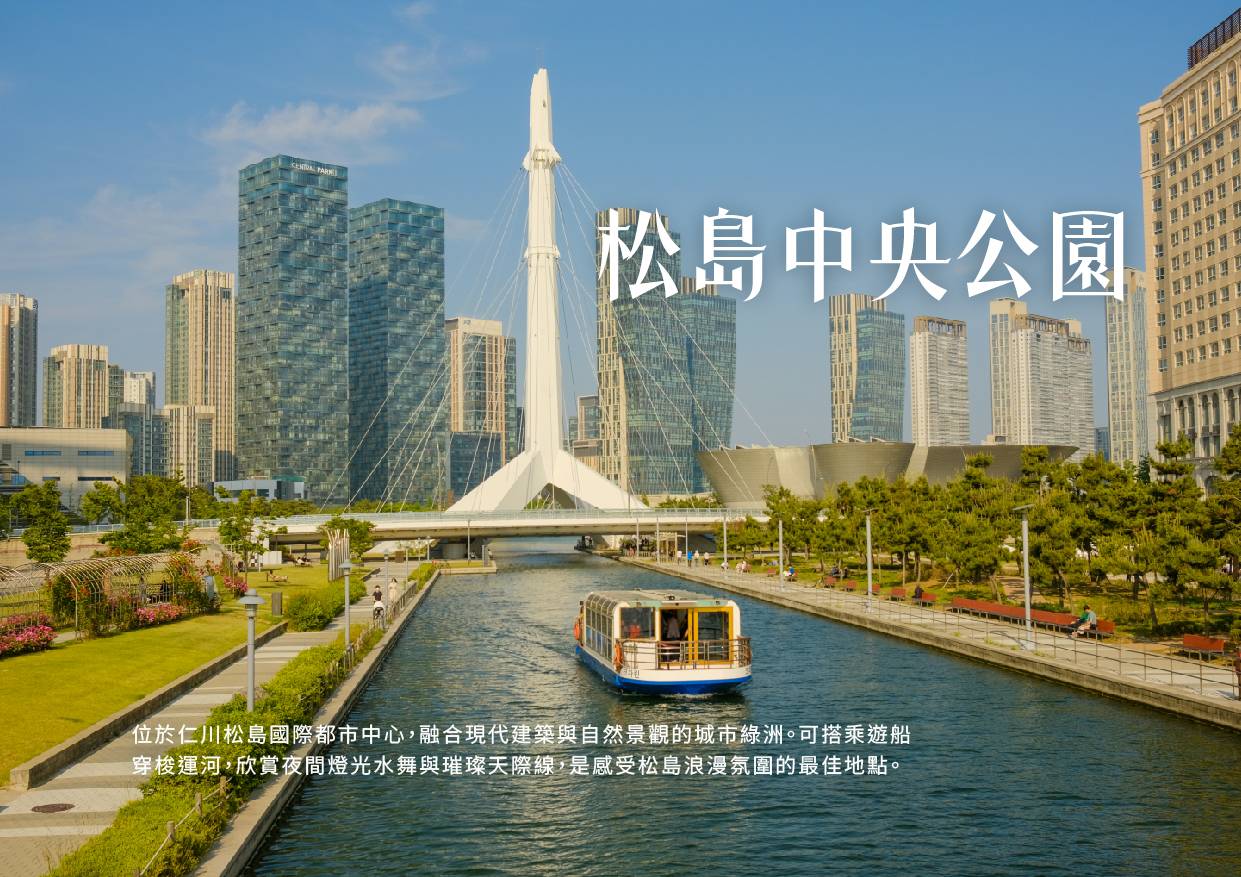 【松島G-Tower】是當地的地標建築之一,以現代感十足的造型與壯觀的玻璃外觀聞名。大樓內設有展望台,可俯瞰松島中央公園、海岸線與高樓林立的城市景觀,白天能欣賞藍天與綠意交織的都市風貌,夜晚則能觀賞璀璨燈火與倒映水面的浪漫景致。這裡同時也是多部韓劇與電影取景地,是遊客拍照、感受未來城市氛圍的熱門景點。