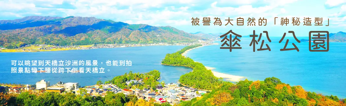 【傘松公園】傘松公園位於京都宮津市天橋立北側山頂,約海拔130 米,是欣賞天橋立「斜一文字」壯觀景致的最佳觀景台之一。搭乘纜車或吊椅上山,在園內的股之窺展望台/天空露台俯瞰松林沙洲,並體驗「胯下看」角度,彷彿見到飛龍升天的奇景 。