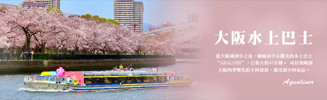 【大阪水上巴士】是遊覽大阪市區河川的觀光船服務,提供不同路線,讓遊客從水路欣賞大阪的都市景觀。代表性的「AQUA LINER」環繞大阪城公園一周,沿途可欣賞大阪城、造幣局及中之島的美麗風光。