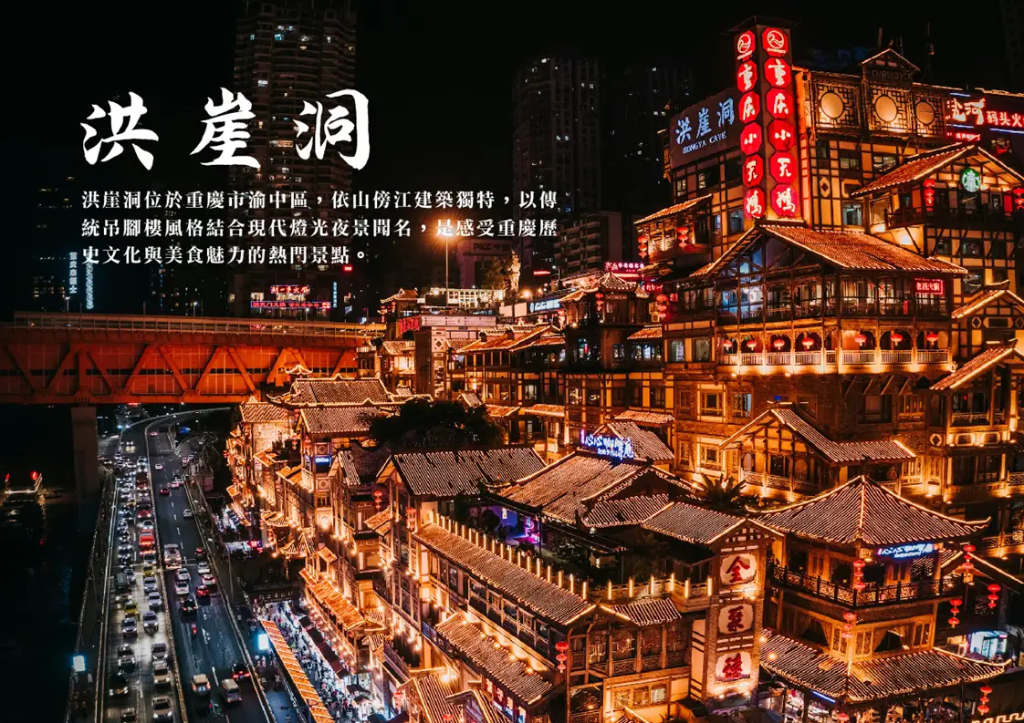 【洪崖洞】是重慶最具代表性的地標之一,以依山而建的「吊腳樓」建築群聞名,夜晚萬家燈火點亮後宛如童話世界。這裡融合餐飲、購物與觀景,能俯瞰嘉陵江與千厮門大橋美景,也是感受山城立體夜景與巴渝文化的必遊之地。