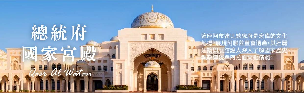 【總統府國家宮殿】(入內參觀)是阿布達比的一座正在使用的總統府,是一座雄偉的文化地標,展現了阿聯酋豐富的遺產。它超越了傳統的宮殿,促進文化理解,展示歷史,並向阿拉伯遺產致敬。其宏偉的設計和開放的大廳反映了其在阿聯酋文化中的重要性。沉浸在知識和傳統中。探索阿聯酋的形成、其執政傳統以及阿拉伯對各個領域的貢獻。
