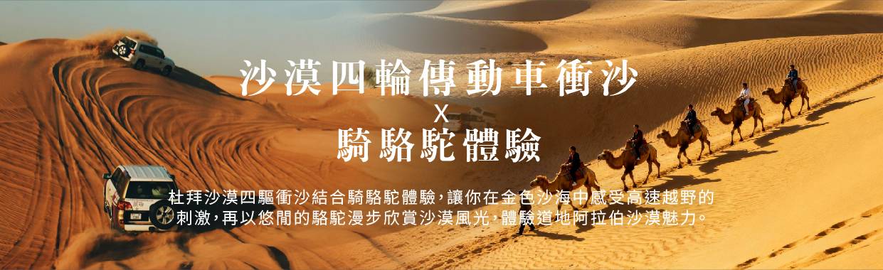 【沙漠四輪傳動車衝沙+騎駱駝體驗+營火BBQ中東燒烤自助餐】傍晚時分前往沙漠地帶,安排刺激無比的活動衝沙。專業四輪驅動吉普車隊將帶領我們體驗在金黃色的沙丘上下馳騁的極大樂趣和刺激。天色已近黃昏,向遠處望去,太陽徐徐下落,落日的餘暉是那樣的迷人,把無垠的沙漠烘托得更加不可思議。隨著日落,沙漠美麗的夜晚也降臨了,很快我們將抵達營地,這是一塊寧靜之地,純正阿拉伯風情,夕陽給四周宏偉的沙丘鍍上餘暉。夜晚降臨,伴隨滿天星斗,正宗的阿拉伯燒烤讓您品嚐當地風味料理。註:建議您可攜帶拖鞋,踩踏在一望無際的沙漠上。