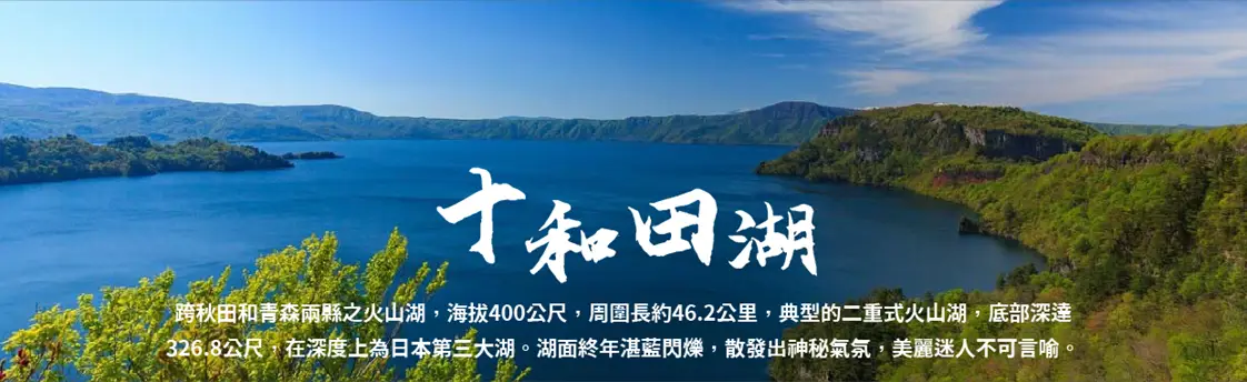 【十和田湖】跨秋田和青森兩縣之火山湖,海拔400公尺,周圍長約46.2公里,典型的二重式火山湖,底部深達326.8公尺,在深度上為日本第三大湖。湖面終年湛藍閃爍,散發出神秘氣氛,美麗迷人不可言喻。