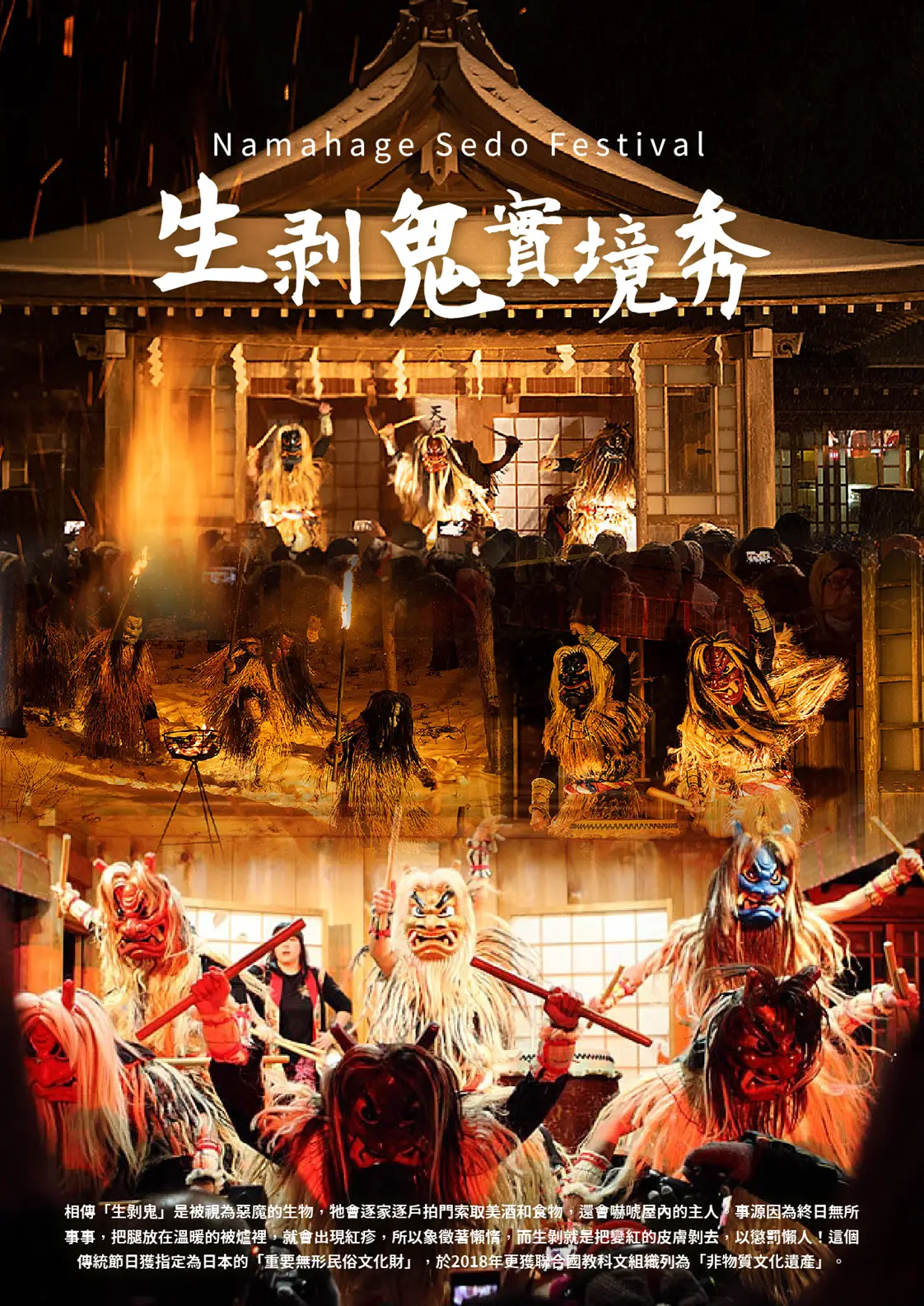 ★★★特別安排★★★【生剥鬼實境秀】生剝鬼節(又稱生剝節),日語是「なまはげ」,是除夕當日(12月31日),秋田縣男鹿市家家戶戶都會舉行的傳統民俗活動。相傳「生剝鬼」是被視為惡魔的生物,牠會逐家逐戶拍門索取美酒和食物,還會嚇唬屋內的主人。「なまはげ」一詞源於當地方言「ナモミ」及「ハゲル」,是「紅疹」及「剝除」的意思。事源因為終日無所事事,把腿放在溫暖的被爐裡,就會出現紅疹,所以象徵著懶惰,而生剝就是把變紅的皮膚剝去,以懲罰懶人!這個傳統節日獲指定為日本的「重要無形民俗文化財」,於2018年更獲聯合國教科文組織列為「非物質文化遺產」。