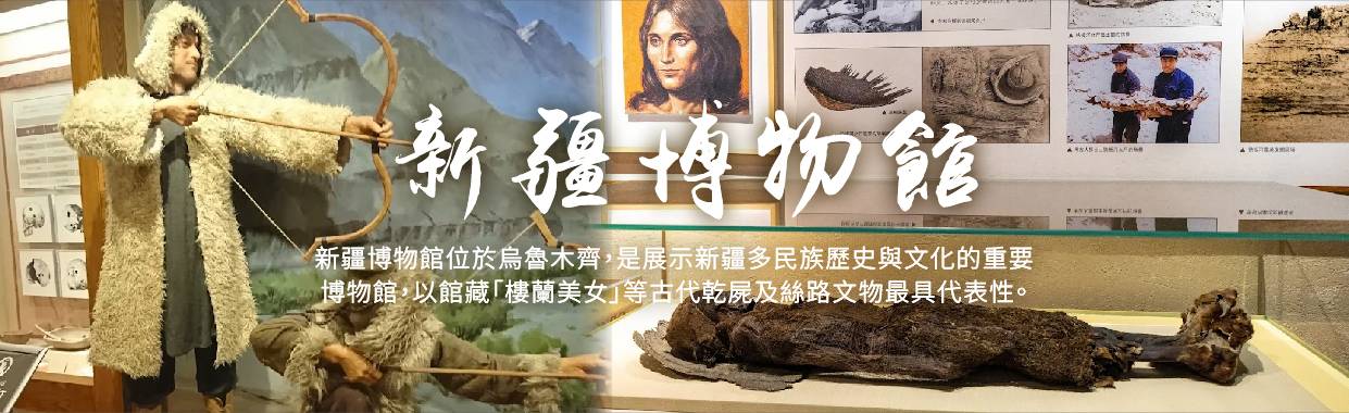 【新疆博物館】是新疆文物收藏和科研中心。其外觀造型具有維吾爾建築風格。館內裝飾亦富有民族特色,共收藏歷史文物、民族文物等五萬餘件。目前常設的展覽有新疆少數民族民俗展覽廳,系統地介紹新疆十二個少數民族在服飾、起居、節慶娛樂、婚喪、禮儀、飲食、宗教及其它方面各具風姿的民情風俗。新疆歷史和出土文物展覽廳,展出了自四、五千年前直至近代從絲綢之路發掘及收集的一千多件珍貴文物,包括錦娟、陶瓷、泥俑、錢幣、碑貼、文書、典籍、兵器、器具等。新疆古屍展覽有距今3800餘年的樓蘭女屍,有距今3200餘年的哈密女屍和距今3000年且末女屍。