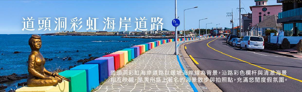 【濟州秘境~道頭峰+彩虹海岸+壁畫村】濟州蔚藍的天空、壹望無垠的海平面、可愛的彩虹石頭矮墩,這些都是龍潭梨湖海岸道路上的美景。坐公車在道頭洞東面站下車,就能看到美麗的彩虹石頭矮墩。彩虹石頭矮墩路總長約需走15~20分鐘。非常適合一邊漫步,一邊拍照。