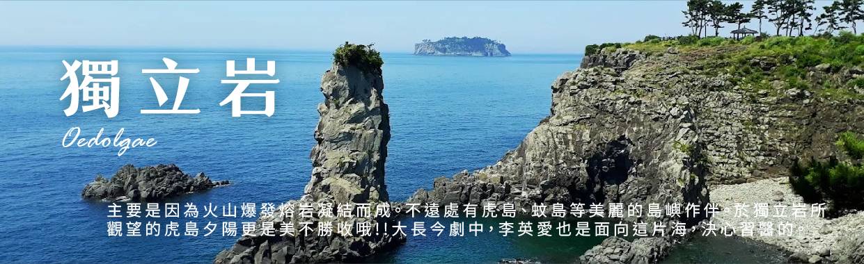 【獨立岩】主要是因為火山爆發熔岩凝結而成。不遠處有虎島、蚊島等美麗的島嶼作伴。於獨立岩所觀望的虎島夕陽更是美不勝收哦!!大長今劇中,李英愛也是面向這片海,決心習醫的。
