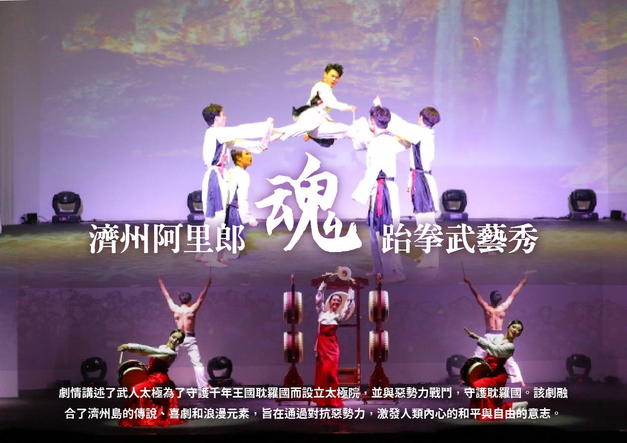 【濟州阿里郎『魂』跆拳武藝秀】劇名:跆拳武藝魂秀,劇情講述了武人太極為了守護千年王國—耽羅國而設立太極院,與惡勢力戰鬥,守護耽羅國。在濟州島的傳說中加入了喜劇和浪漫故事。宗旨是透過與惡勢力的對決,從人類內心引出和平與自由的意志。韓國標誌性象徵歌曲《阿里郎》也會帶來强烈的反響。跆拳道與精彩的表演相結合,從剛開始學跆拳道的孩子到不懂跆拳道的外國人,都可以盡情享受。特別是跆拳道動作中的擊破示範,更是精彩絕倫。每當成功擊破超過成人身高的踢腳時,觀眾都會爆發出歡呼聲。也有觀眾親自登上舞臺參與跆拳道表演的時間,因此無論從教育角度還是體驗旅行都非常適合。