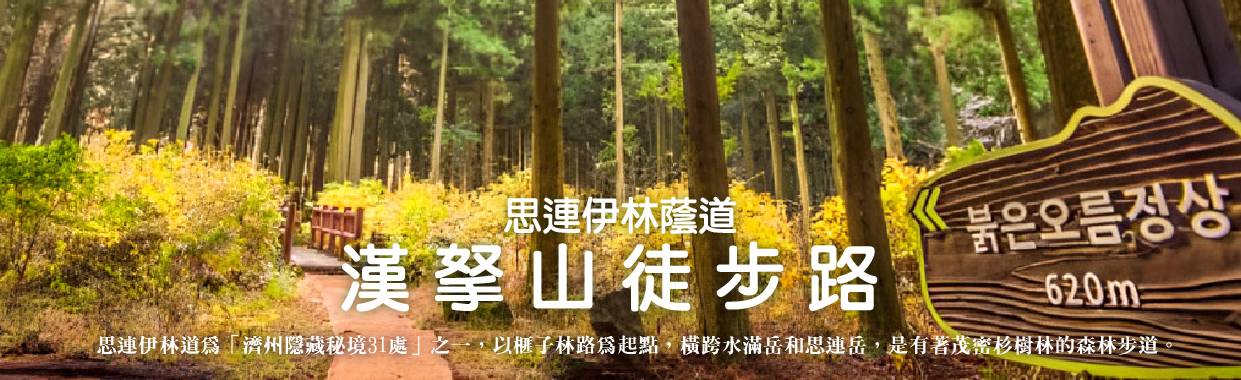 【漢拏山徒步路(思連伊林蔭道)】漢拏山是韓國三大名山之一,海拔足有1950公尺,巍然聳立於島中央,壯闊的山勢與豐富的生態資源讓她成為濟州島的象徵,不僅是濟州的最高峰,也是南韓最高的山,也是韓國人心目中的聖山。徒步路為環山平地徒步路線,並不是登頂漢拏山的路線,環漢拿山徒步路被指定為《韓國國家級林蔭道》。
