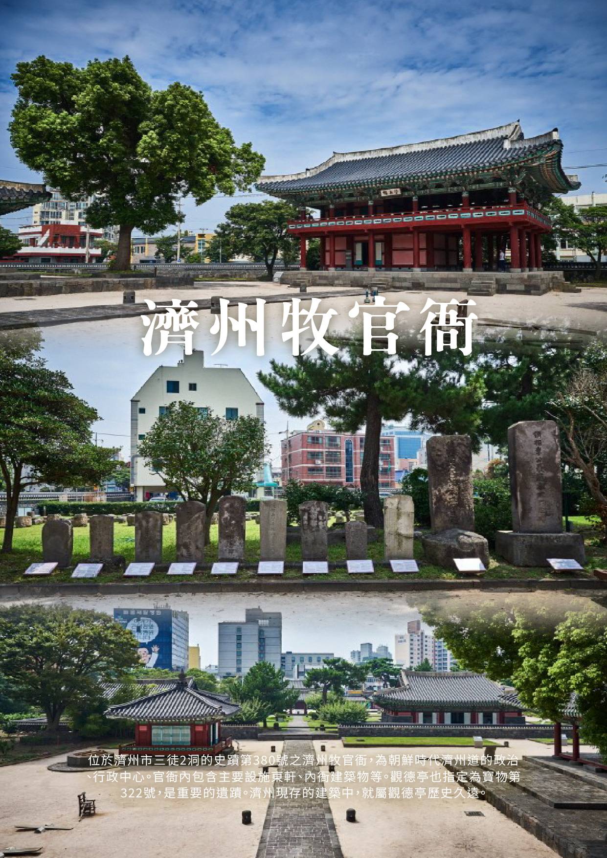 【觀德亭】濟州道內歷史最為悠久的建築物之一的觀德亭,於1963年1月21日被指定為第322號寶物,朝鮮時代世宗30年(1448年)牧使辛淑晴為訓練士兵所創建的。觀德之名取義自「射箭的人平常為端正心思,培養出眾的德行」,觀德亭的橫樑上刻劃著十長生圖、赤壁大捷圖、大狩獵圖等高格調的壁畫,另外觀德亭的匾額是出自安平大君親手題字流傳至今的。
