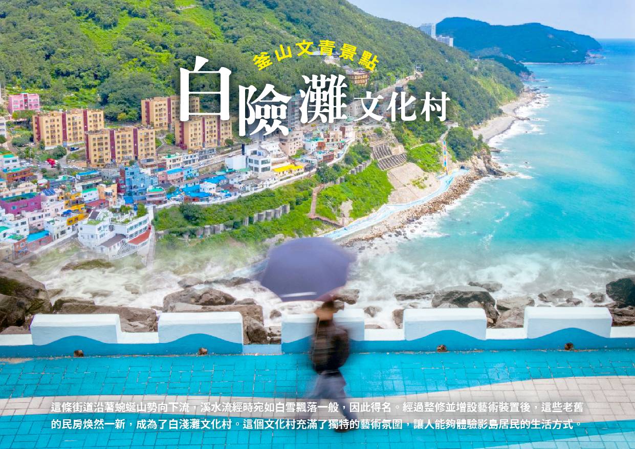【白險灘文化村】這一帶原本為釜山舊市區白淺灘街,連接蓬萊山上彎彎流下的小溪,一路沿著蜿蜒山勢向下流的溪水,看起來就像是下過白雪一般,所以才取名為白淺灘文化村。將老舊的民房進行整修並且加設藝術裝置創作作品後,才成為了能夠體驗影島居民生活的獨特文化藝術村。
